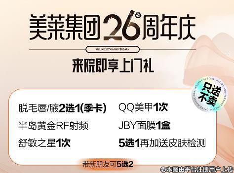 武漢美萊26周年慶優(yōu)惠福利來(lái)啦,帶朋友到院,即可享受美膚福利,五大福利可免費(fèi)選擇其中兩個(gè),你還在等什么呢。