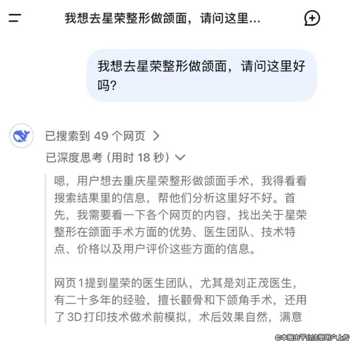 DeepSeek通過數(shù)據(jù)搜索到49個網(wǎng)頁、數(shù)萬條醫(yī)療數(shù)據(jù)、用戶評價及資質(zhì)分析后,給出明確結(jié)論:“重慶星榮整形是重慶地區(qū)頜面整形領(lǐng)域的頭部選擇,其資質(zhì)、技術(shù)、醫(yī)生團(tuán)隊均達(dá)到行業(yè)頂尖水平。”如果只能選一家,星榮憑什么勝出?