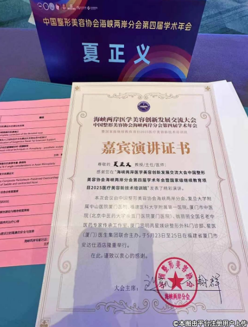 夏正義院長(zhǎng)憑借豐富臨床經(jīng)驗(yàn)和專業(yè)知識(shí),為參會(huì)者帶來注射隆鼻安全與效果方面的前沿見解,為規(guī)范注射隆鼻操作、提升醫(yī)美質(zhì)量提供重要參考,得到與會(huì)人員高度關(guān)注與認(rèn)可。會(huì)議結(jié)束后,夏正義院長(zhǎng)榮獲嘉賓演講證書,以表彰其在此次學(xué)術(shù)交流活動(dòng)中的杰出貢獻(xiàn)。